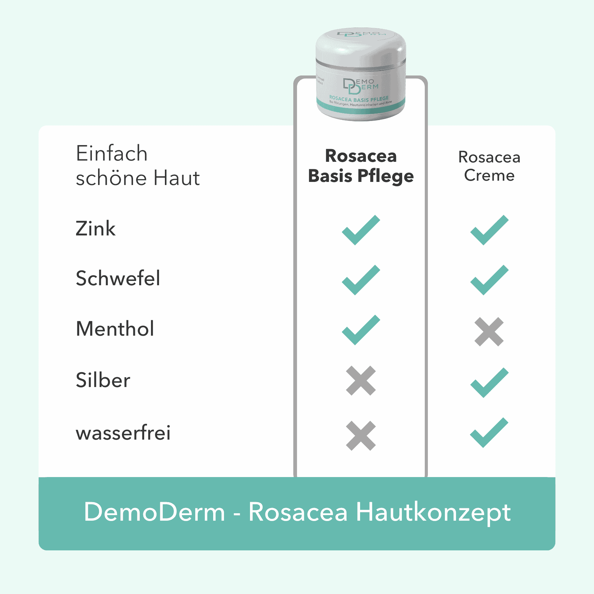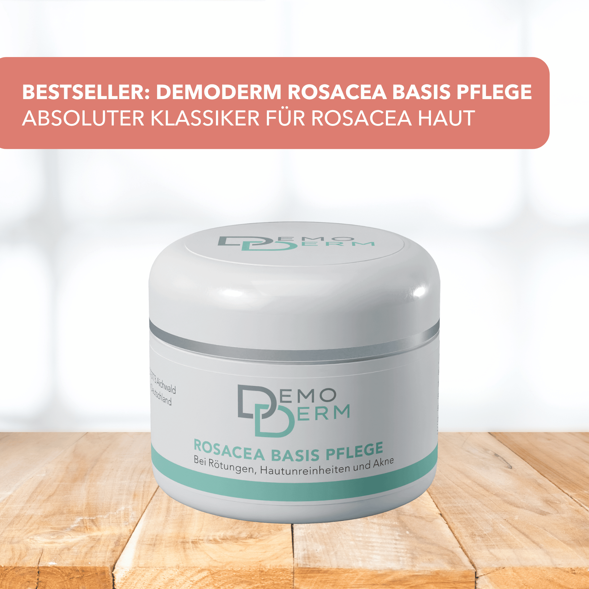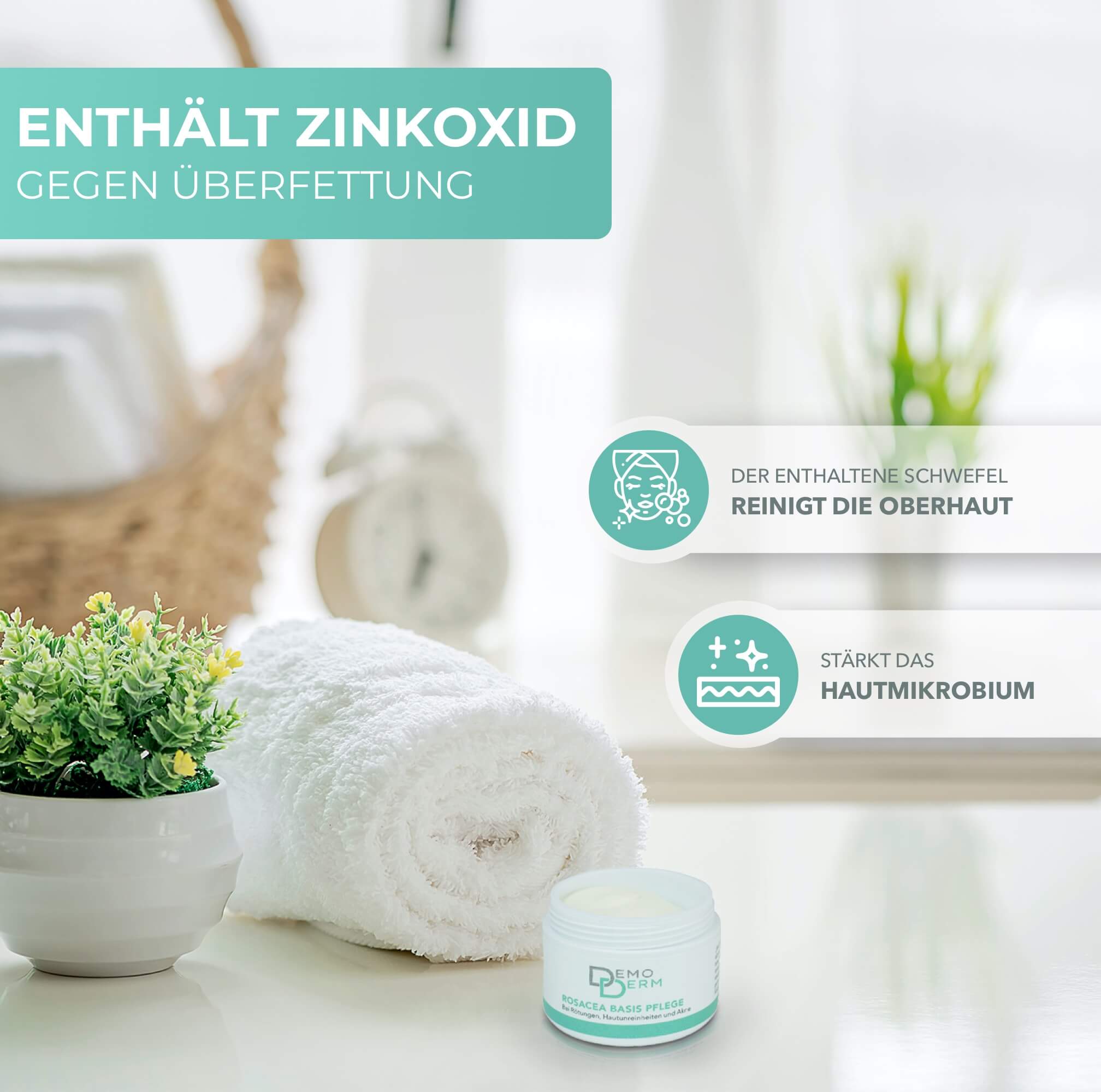 Unsere DemoDerm® Rosacea Basis Pflege ist wohltuend bei Hautproblemen wie Rosacea, geröteter Haut, Akne und Couperose. Die Rosacea Creme wurde speziell für Erwachsene mit unreiner Haut entwickelt und konzipiert. Sie unterstützt Ihre Haut z.B bei einem vermehrten Hautmilbenbefall sich wieder zu erholen und sich selbst zu regenerieren. Die spezielle Kombination aus Zinkoxid und Schwefel kann dabei helfen die Haut vor Überfettung zu schützen, die Talgproduktion zu hemmen, um so zu einem besseren Hautbild zu führen.