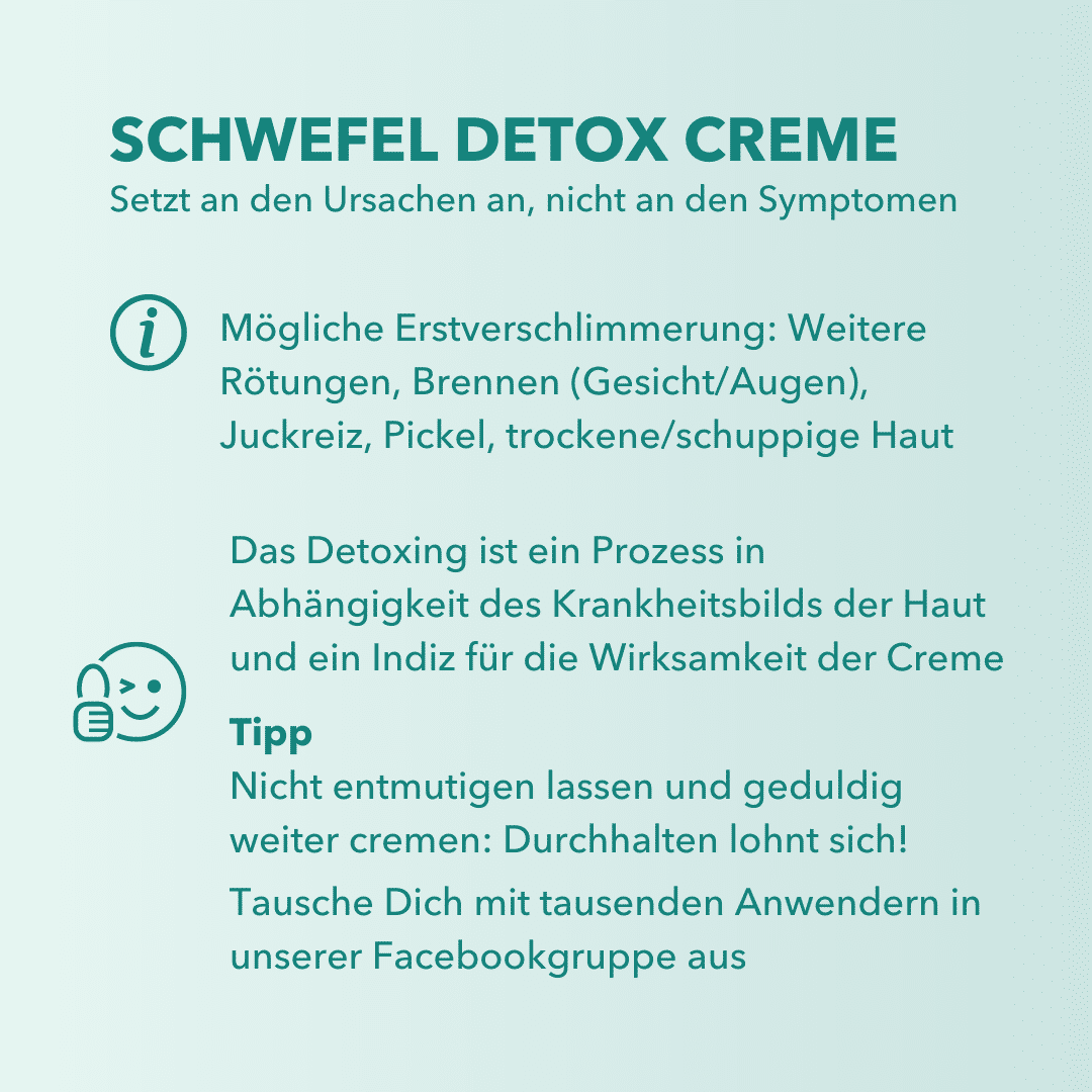In der Regel verbessert sich die Haut durch das Cremen mit der DemoDerm Rosacea Basis Pflege. In einigen Fällen verschlechtert sich die Haut vorübergehend innerhalb der ersten Wochen des Cremens. Beides, sowohl eine schöne Haut, wie auch eine vorrübergehende Verschlechterung sind Hinweise auf die Wirksamkeit von DemoDerm. Lassen Sie sich von einer vorrübergehenden Verschlechterung der Haut nicht entmutigen. Cremen Sie die DemoDerm Rosacea Basis Pflege lange genug. Durchhalten lohnt sich, das bestätigen uns DemoDerm Anwender immer wieder aufs Neue.