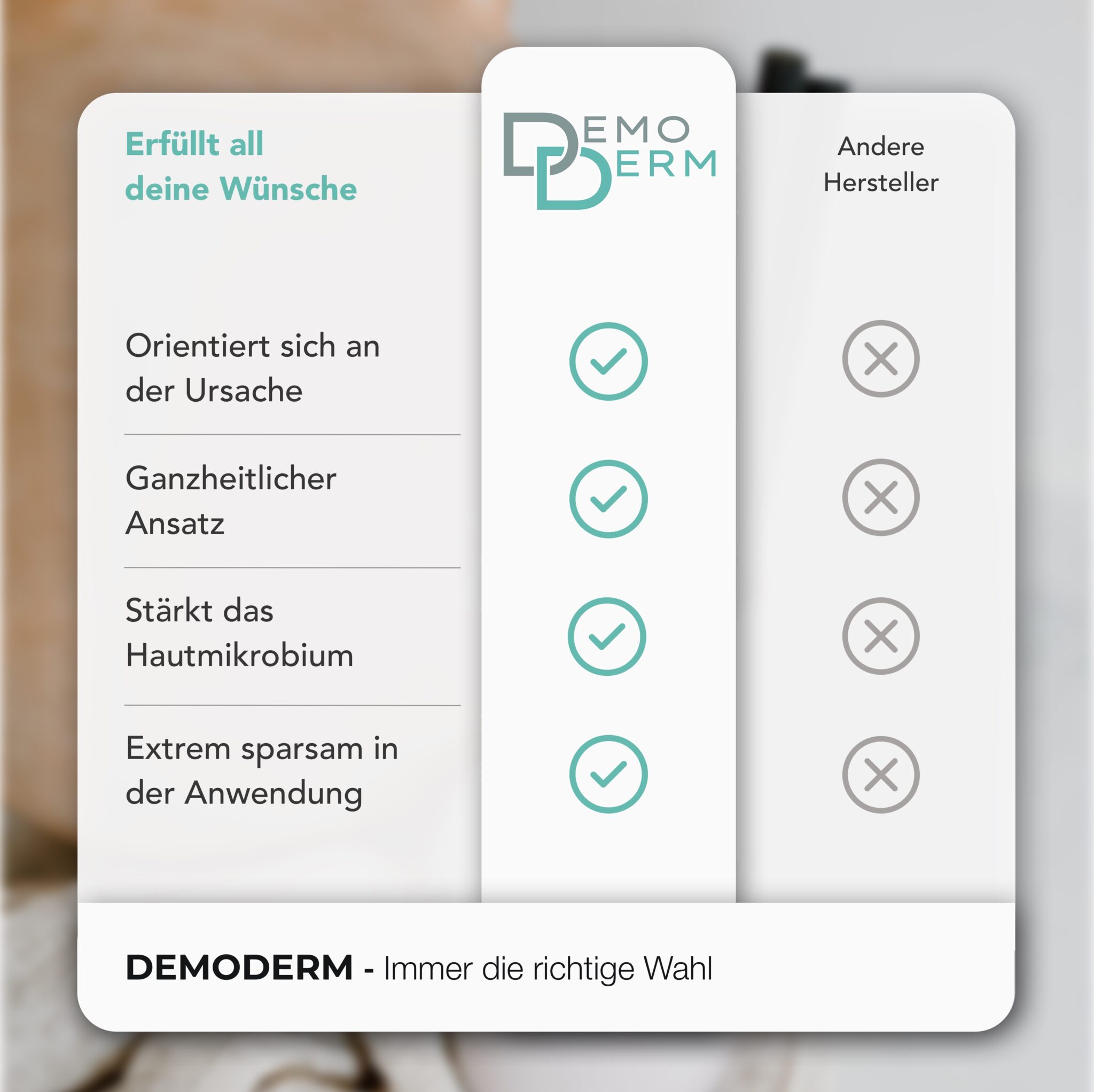 DemoDerm® eignet sich begleitend für alle Maßnahmen, die das Ziel der körpereigenen Hautregeneration, die Stärkung der Hautbarriere und die Optimierung des Hautmikrobioms als Ziel haben.